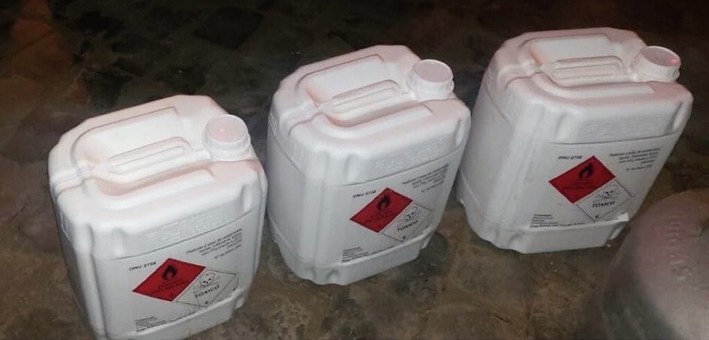 As guarnições da Polícia Militar foram empenhadas para verificar três homens que estavam em atitude suspeita em um posto de combustível. Foi realizada a abordagem veicular e encontraram no interior do veículo três galões de defensivos agrícolas.