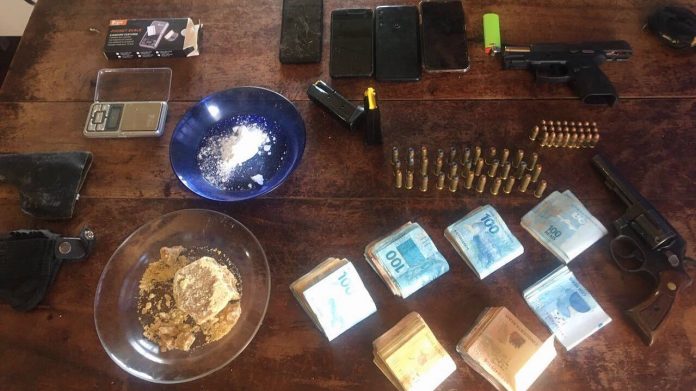 A mulher autorizou a entrada dos policiais militares na residência e no seu interior, durante as buscas, foram encontradas uma Pistola Taurus calibre 9mm com numeração suprimida e dois carregadores, um Revólver Taurus calibre .38, 33 munições de calibre .38, 25 munições de calibre 9mm, 192,8 gramas de substância análoga a Crack, 45,8 gramas de substância análoga a Cocaína, uma balança de precisão, R$ 7.000,00 em espécie, quatro celulares e um notebook.