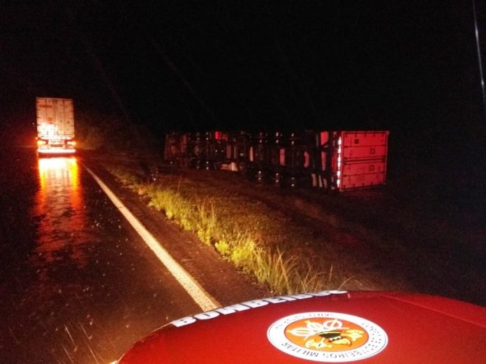 Uma carreta Iveco/Stralis com placas de Videira tombou na madrugada desta terça-feira (3) na BR-470, em Curitibanos. O veículo seguia pela rodovia quando saiu da pista por volta da 0h45min nas proximidades da ponte do Rio Marombas.