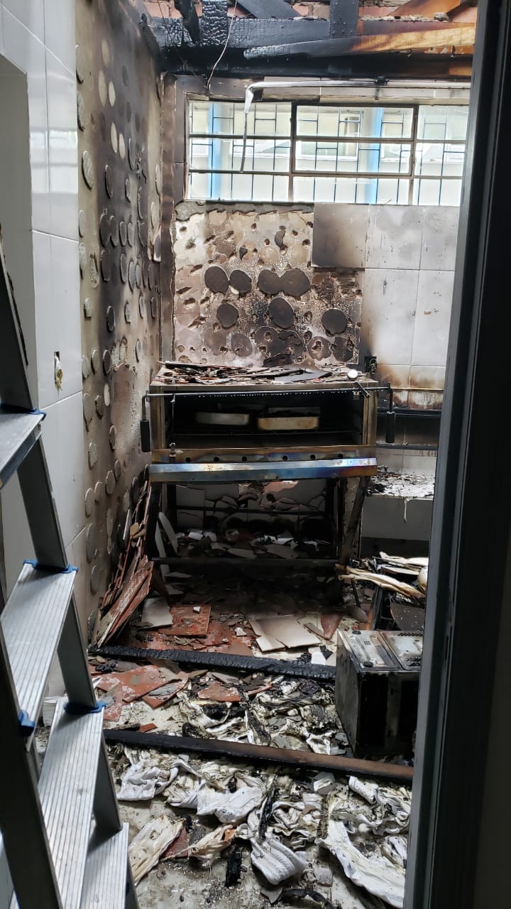 A corporação foi acionada por volta das 15h para atender o incêndio, que estava confinado na cozinha da instituição. Foi necessário quebrar a porta de vidro para ter acesso ao foco.