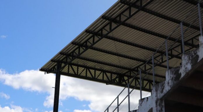 As coberturas sobre as arquibancadas do Estágio Municipal Wilmar Ortigari, no bairro São Francisco, começaram a tomar forma na última semana. Uma das estruturas está 100% concluída e a outra já está em processo de montagem.