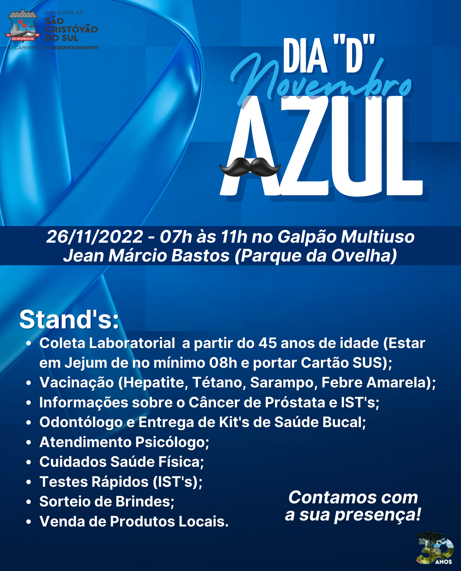 A administração municipal de São Cristóvão do Sul, através da Secretaria de Saúde promove no próximo dia 26 de novembro, um sábado, o Dia “D” do Novembro Azul, mês destinado a Prevenção e Conscientização sobre o Câncer de Próstata.