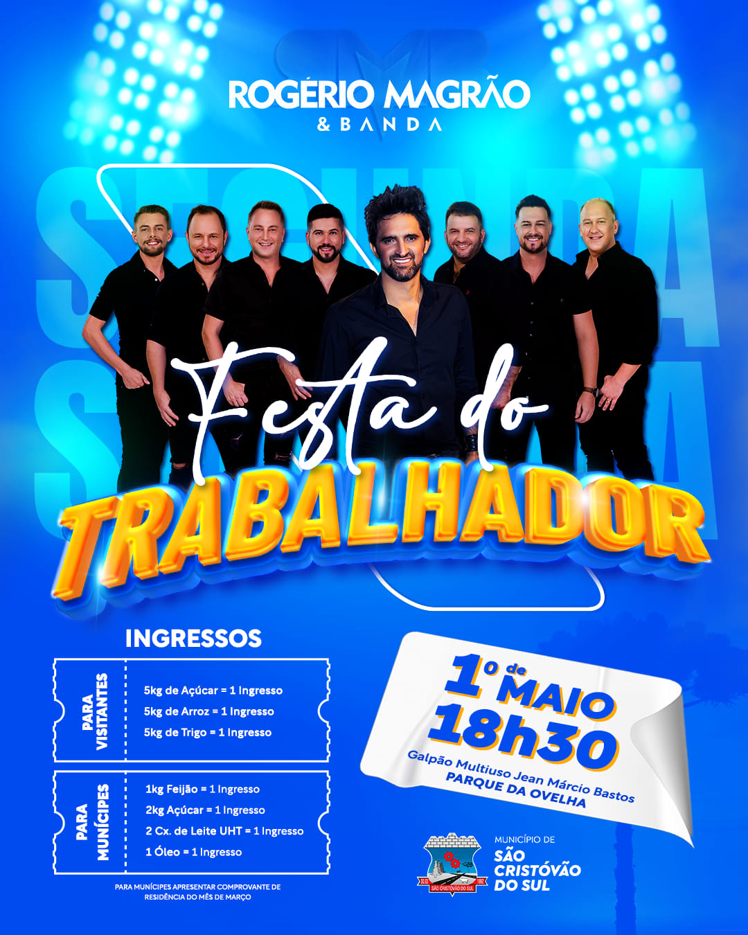 Já às 18h30min Grandioso Baile com Rogério Magrão e Banda, que será realizado no Galpão Multiuso Jean Márcio Bastos (Parque da Ovelha), O Valor dos Ingressos são alimentos não perecíveis e trocados na Prefeitura Municipal.
