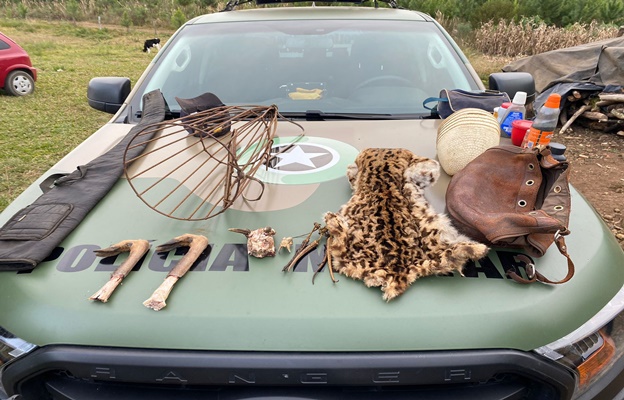 Em conversa com a responsável pelo imóvel, os militares observaram carcaças de animais silvestres como veado, tatu, o couro de uma jaguatirica e de um quati. As partes estavam pendurados nas paredes da casa.