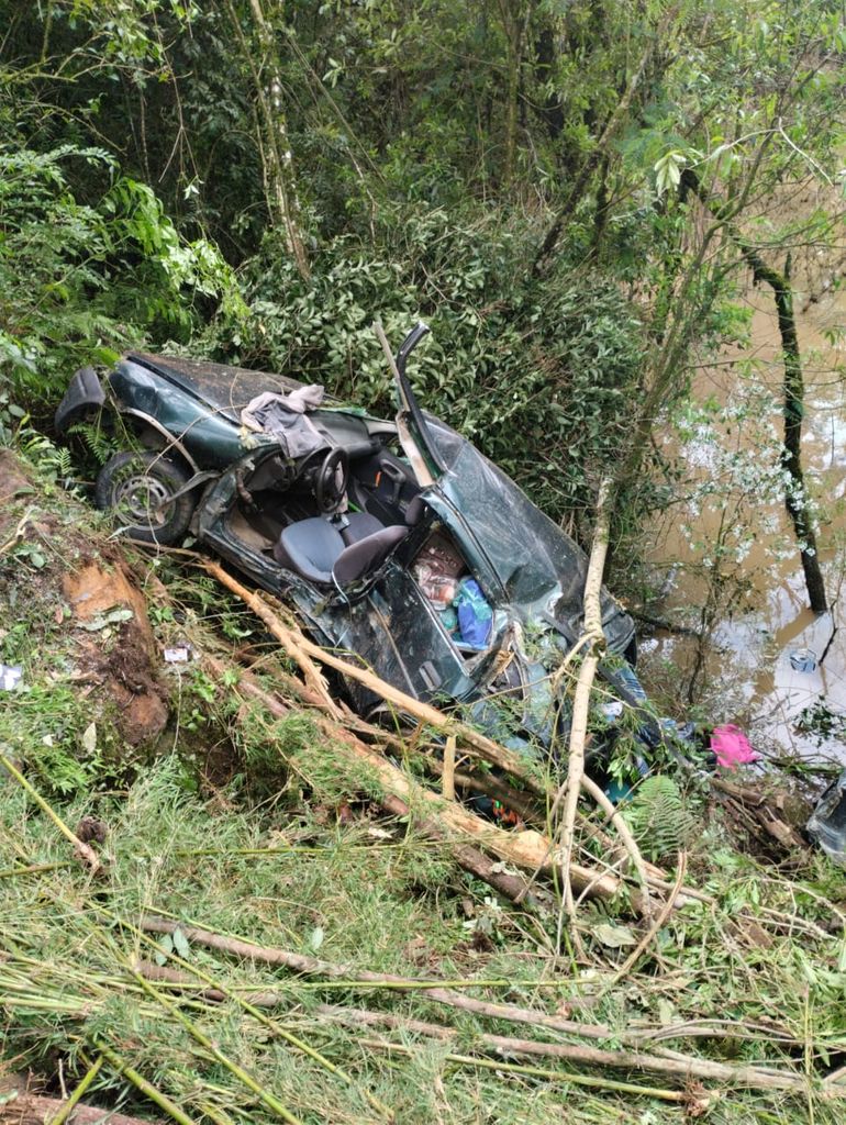 Um GM Corsa, com placas de Ituporanga/SC, saiu da pista e capotou às margens do rio. O motorista, um homem de 30 anos, conseguiu sair do veículo, no entanto, uma passageira, de 40 anos, foi encontrada no interior do veículo em estado crítico, após sofrer uma parada cardiorrespiratória.