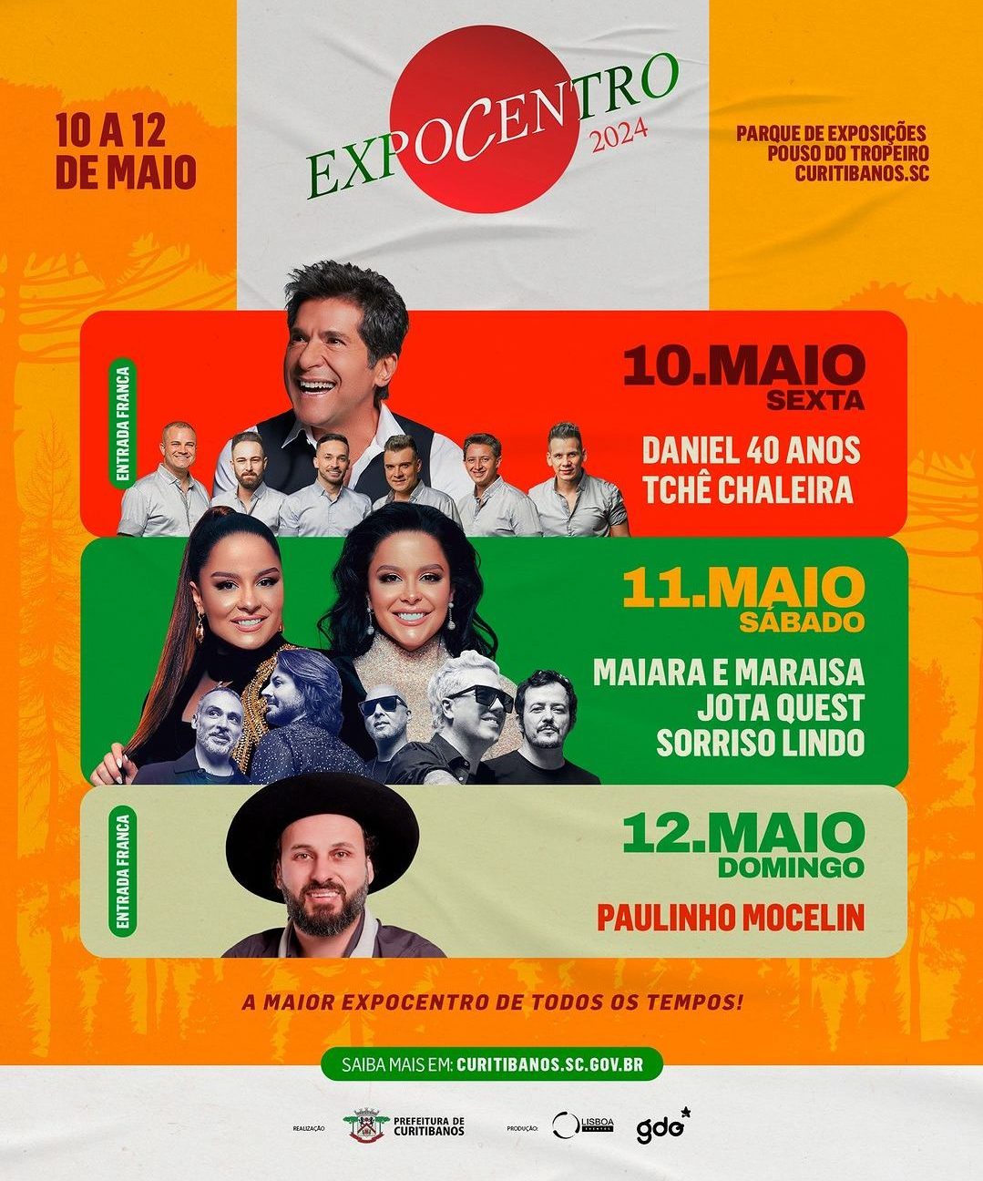 Curitibanos e Região Maiara e Maraisa, Jota Quest e Daniel são as principais atrações da Expocentro 2024 Por Portal Coroado - 24 de janeiro de 2024 0 1485 Compartilhar no Facebook Tweet Informações com o repórter Lucas Betiolo © Portal Coroado – Todos os direitos reservados. Este material não pode ser publicado, transmitido por broadcast, reescrito ou redistribuído sem autorização.