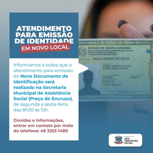 O município de São Cristóvão do Sul passou a realizar a emissão do Novo Documento de Identificação na Secretaria Municipal de Assistência Social (Praça do Encruzo), de segunda a sexta-feira, das 8h30 às 12h.