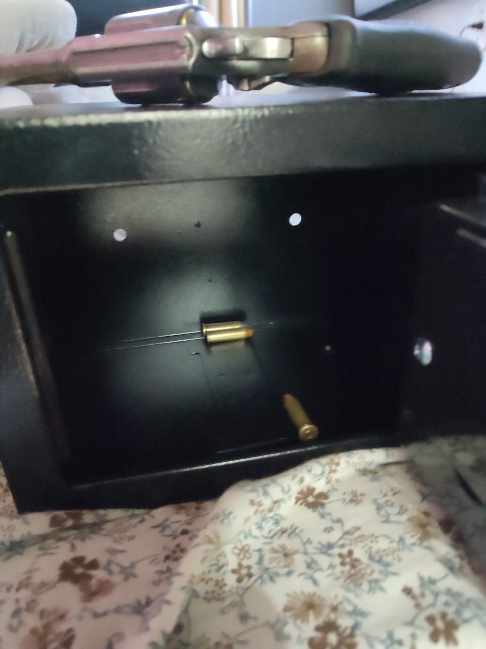 Durante as buscas no imóvel, os Policiais Civis encontraram uma arma de fogo e munições, sem o devido registro, as quais estavam guardadas dentro de um cofre, assim como foi localizada certa quantidade de “cocaína”.