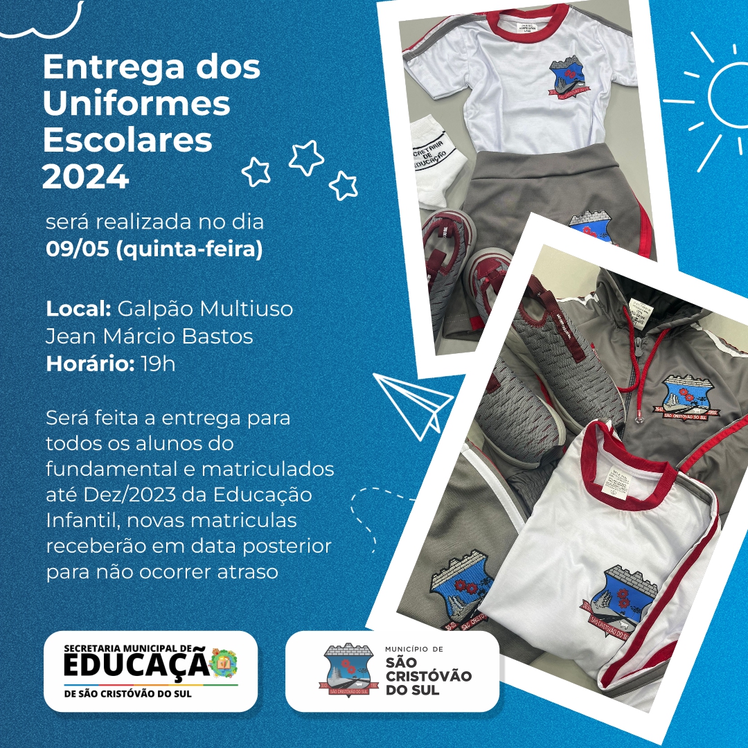 A Prefeitura de São Cristóvão do Sul, por meio da Secretaria Municipal de Ensino, realizará a entrega, no dia 09 de maio, quinta-feira, dos uniformes escolares para os estudantes do ensino fundamental e matriculados até dez/2023 da Educação Infantil.