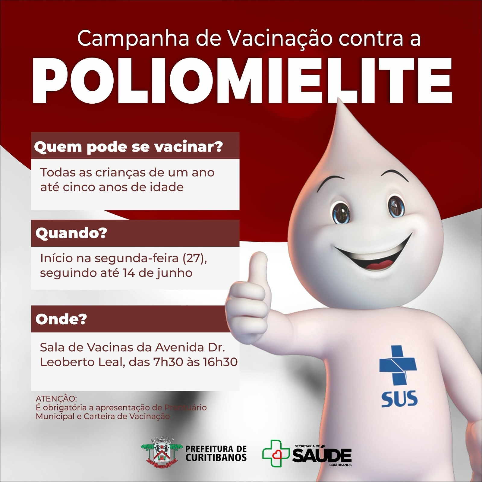 A partir de segunda-feira (27), inicia na Sala de Vacinas localizada na Avenida Leoberto Leal a vacinação contra a Poliomielite, seguindo até 14 de junho. O horário de atendimento da sala é das 7h30 às 16h30, sem fechar para o almoço.