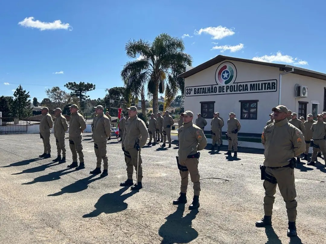 O 33º Batalhão de Policia Militar de Curitibanos promoveu na manhã desta segunda-feira, 12 de agosto, uma nova solenidade de promoção de praças policiais militares e entrega de brasões de mérito.