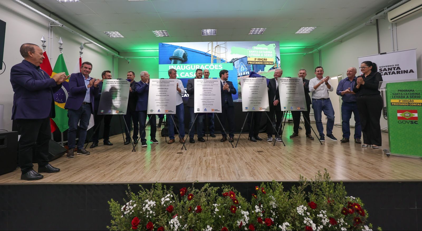 A edição do Programa Santa Catarina Levada a Sério – Prestando Contas na manhã de sexta-feira, 9, contou com a inauguração de quatro reservatórios de água e uma ampliação de Sistema de Esgotamento Sanitário da Companhia Catarinense de Águas e Saneamento (Casan). O descerramento simbólico das placas pelo governador Jorginho Mello, o presidente da Companhia, Edson Moritz e demais autoridades, aconteceu em Curitibanos, município-sede da Associação dos Municípios da Região do Contestado (AMURC).