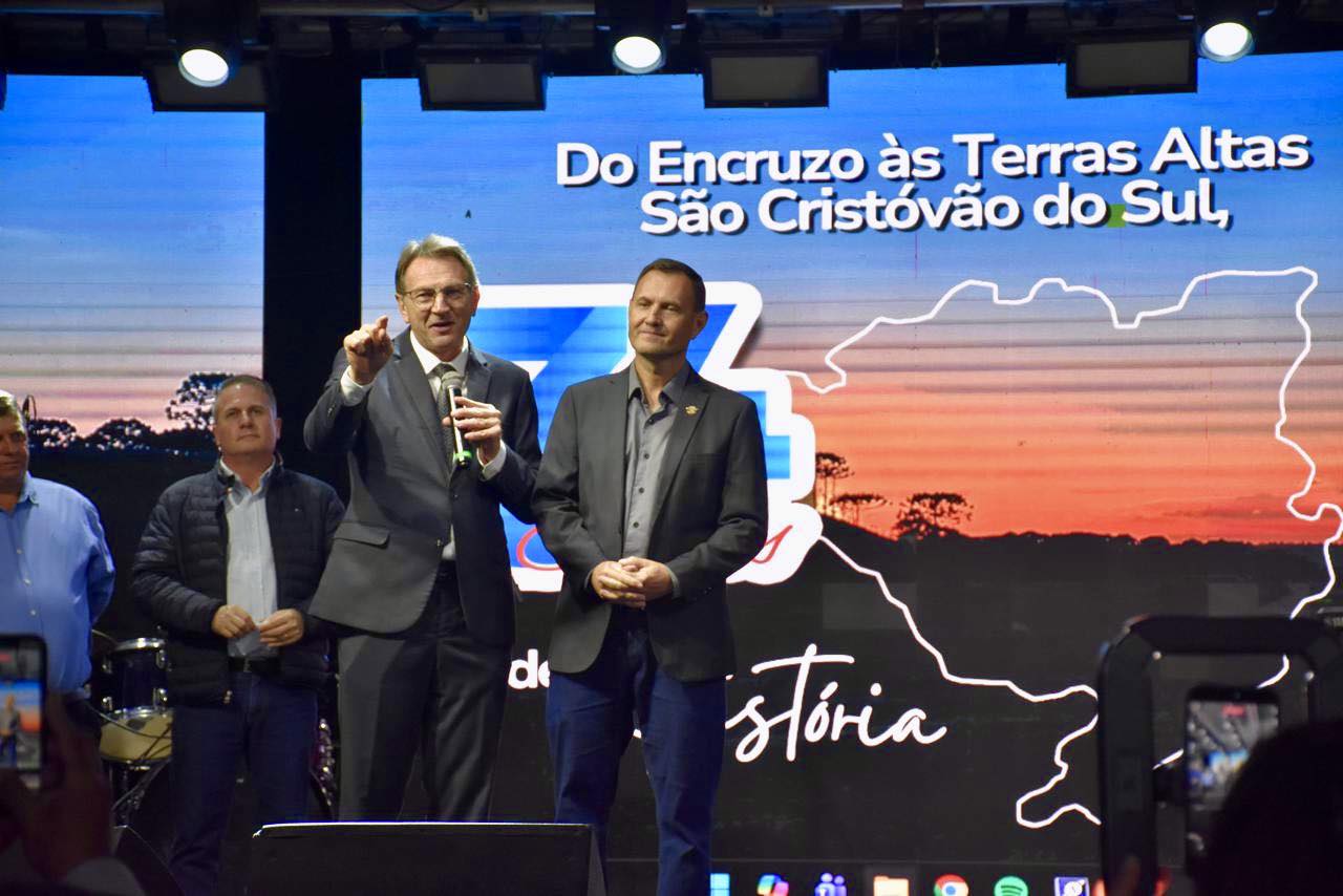 Outro destaque da festa de 34 anos do município de São Cristóvão do Sul, realizada no final de semana no Parque da Ovelha, foi o anuncio da adesão do município ao Programa Estrada Boa Rural, do governo do estado, para a pavimentação da rodovia Ulisses Gaboardi.